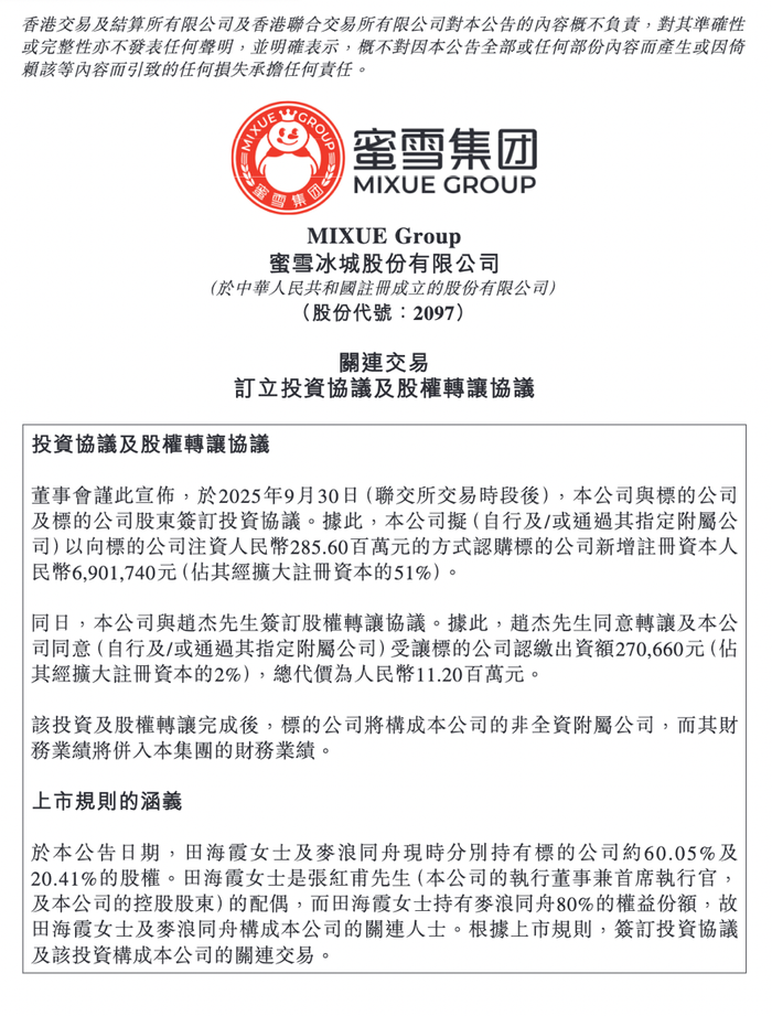 10月1日,蜜雪冰城发布公告称,公司已于9月30日以合计2.97亿元获得鲜啤福鹿家53%股权。交易完成后,鲜啤福鹿家成为蜜雪冰城集团的非全资附属公司,将与蜜雪冰城、幸运咖形成协同。至此,蜜雪集团业务版图从现制果饮、茶饮、冰淇淋和咖啡延伸至现打鲜啤。
