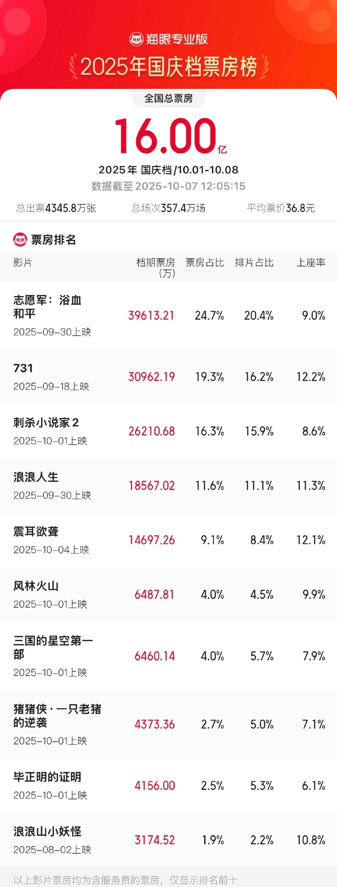 据猫眼专业版数据,截至10月7日12时05分,2025年国庆档档期票房破16亿元,《志愿军:浴血和平》《731》《刺杀小说家2》分列前三位。