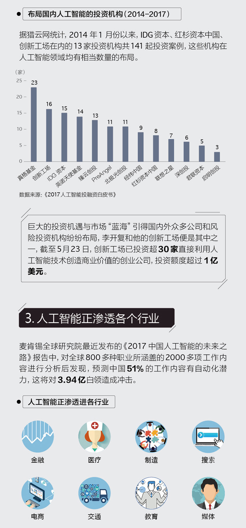 人工智能正处于大规模爆发的前夜,麦肯锡全球研究院的研究报告指出,在现今所有工作内容之中,过半会在2055年左右自动化。
