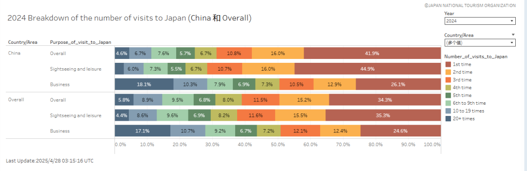 “去中心化”与“深度体验化”的融合,使日本旅游呈现出远高于传统模式的复购特征。JINTO数据显示,2024年中国游客中首次访日者占比为41.9%,高于全球平均的34.3%。更值得注意的是,有10.7%的游客曾三次以上赴日旅游,甚至有6%的游客选择二十次及以上。