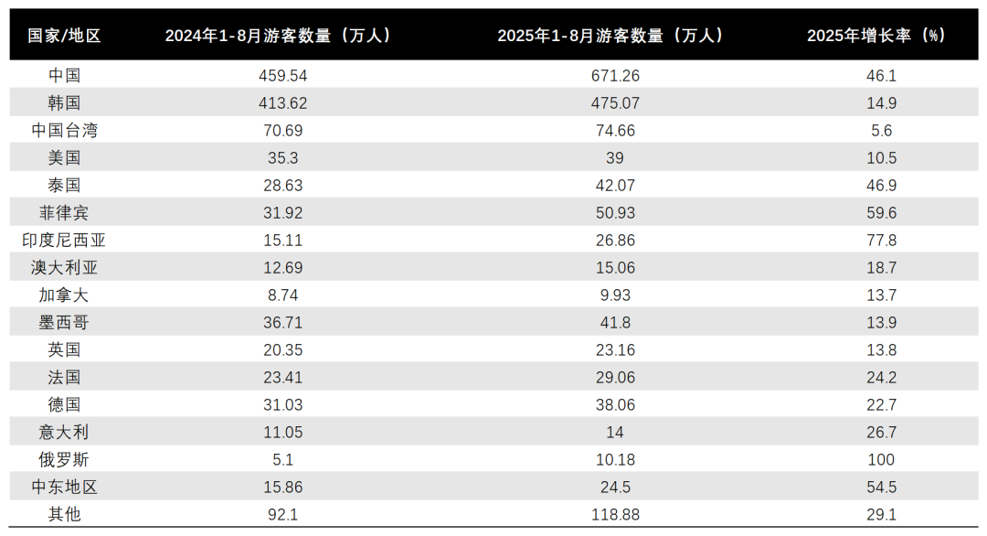 从游客体量来看,中国大陆(671.26万人次)与韩国(475.07万人次)仍为日本最大的两大客源市场,共同构筑了日本入境游的基本盘。整体数据反映出日本旅游吸引力持续增强,客源结构进一步多元化。