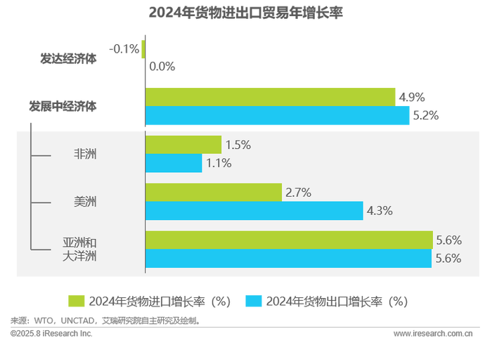 2020年至2024年,全球进出口贸易总体呈现稳步回升态势,并逐步迈入结构优化阶段。在总量增速趋缓的背景下,服务贸易持续展现出更强劲的增长势头,成为驱动全球贸易扩张的核心力量。这反映出全球产业结构正加速由传统制造导向,向数字服务、知识产权以及金融与科技服务等领域转型。与此同时,全球区域表现显著分化,亚洲和大洋洲等新兴经济体在全球贸易中的地位持续提升。相比之下,发达经济体在2024年则整体陷入低速甚至零增长的困境。全球贸易重心正加快向发展中经济体转移,服务化、数字化和区域合作将共同推动新一轮全球贸易格局重塑。值得关注的是,受美国加征关税与全球经济不确定性影响,世界贸易组织(WTO)于2025年4月将今年全球商品贸易额增幅从年初预期的+2.7 %调整为 0.2 %,反映出全球贸易面临的系统性风险持续上升。