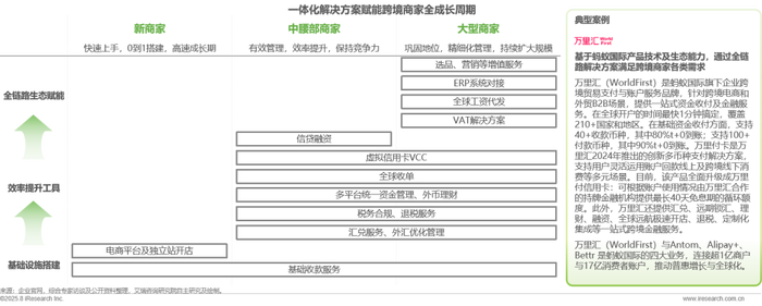 跨境支付服务商是跨境贸易生态的重要参与者之一,通过提供刚需的收款和支付服务,与跨境商家建立深入连接,培养商家信任度并发现其真实需求及痛点。跨境支付服务商通过纵向深化及横向拓展延伸出一系列增值服务,全链路赋能跨境商家全成长周期。从帮助新进入的商家一键开店、实现0到1快速搭建,伴随着商家的规模成长与渠道扩张,提供外汇、税务、资金管理、融资、VCC等相关服务,直至陪伴其成长为大型头部商家,服务商提供选品、营销、ERP系统对接等一站式衍生服务。