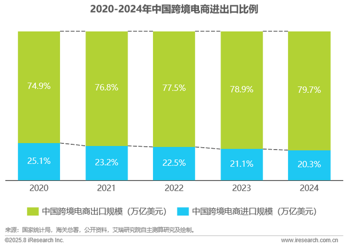 2020年至2024年,中国跨境电商保持稳中有进,年均复合增长率约为15%,全球份额维持在50%以上,凸显其在全球电商供应体系中的关键地位。从进出口结构来看,出口端以17%的年均复合增长率持续主导增长格局,成为稳外贸、促结构优化的重要力量。相比之下,进口端增速相对平稳,年均复合增长率约10%,聚焦功能性、健康消费与新兴品牌的引入。2025年以来,中美贸易摩擦仍对行业构成挑战,美国取消低货值小包免税优惠并对部分商品加征关税,但双边贸易对话和部分关税的阶段性回调,为跨境电商企业提供了调整空间。面对复杂外部环境,中国跨境电商正加速推进供应链数字化、海外本地化运营及品牌建设,提升全球价值链中的控制力和竞争力,推动行业从规模扩张向高质量发展转型。