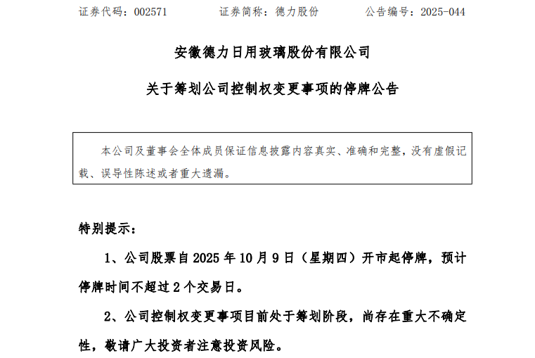 德力股份称,该事项可能导致公司控股股东及实控人发生变更。鉴于该事项处于筹划阶段,尚存在重大不确定性,经公司向深交所申请,公司股票自10月9日(星期四)开市起停牌,预计停牌时间不超过2个交易日。