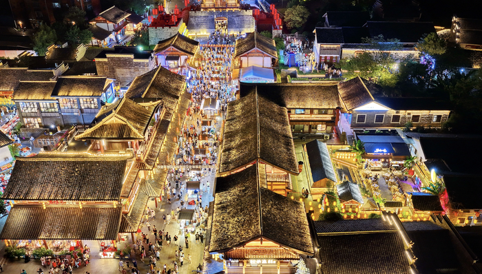2025年10月7日,江西省赣州市章贡区江南宋城历史文化街区灯光璀璨,不少市民和游客前来观光,品尝购买美食,乐享假日生活。图片来源:CFP