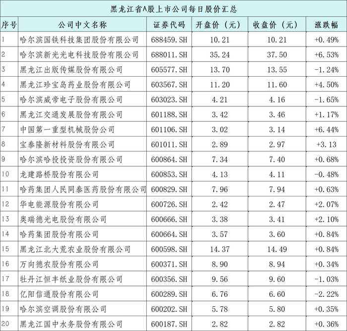黑龙江作为我国东北地区的重要经济支柱,其资本市场动态备受关注。本文表格每日更新,汇总黑龙江省主要A股上市公司的开盘价与收盘价。数据来源为公开证券市场统计,仅供参考,不构成投资建议。投资者据此操作,风险自担。