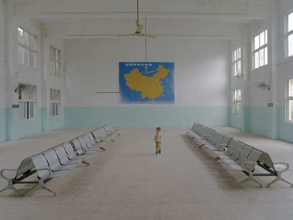 还有一张也是小孩。那是在重庆江津朱杨溪,一个建成于上世纪四十年代的老火车站,位于成渝铁路线上。当地人说,能从这里前往重庆的永川等小站点,但在网上似乎买不到这个站的车票,得先上车,再找列车员补票。我去朱杨溪站时,其他乘客都走到该站下面的露天坝子聊天。我想,如果只拍车站的静态场景,画面会缺少些东西。于是就按照自己的习惯,继续等。让我惊喜的人或事,往往需要等待。一个小男孩和爷爷一起在候车,爷爷见我架起相机,以为我是记者,就来和我聊天。小男孩则跑到一旁去看地图。开始他是背对着我的,一直盯着地图。爷爷担心他乱跑,提醒书“别乱走,小心人贩子把你抓走”。这时小男孩突然回头,我很敏锐地捕捉到了他回眸的瞬间。拍下照片的那一刻,我有种幸福感。