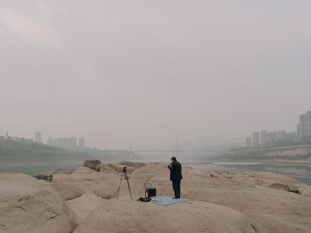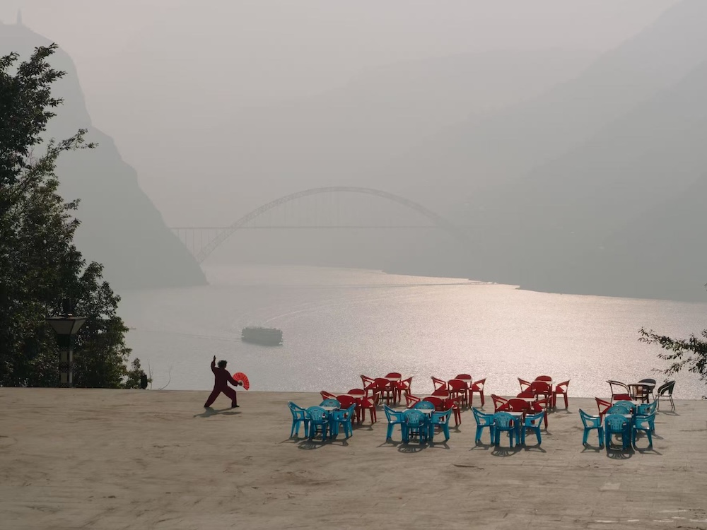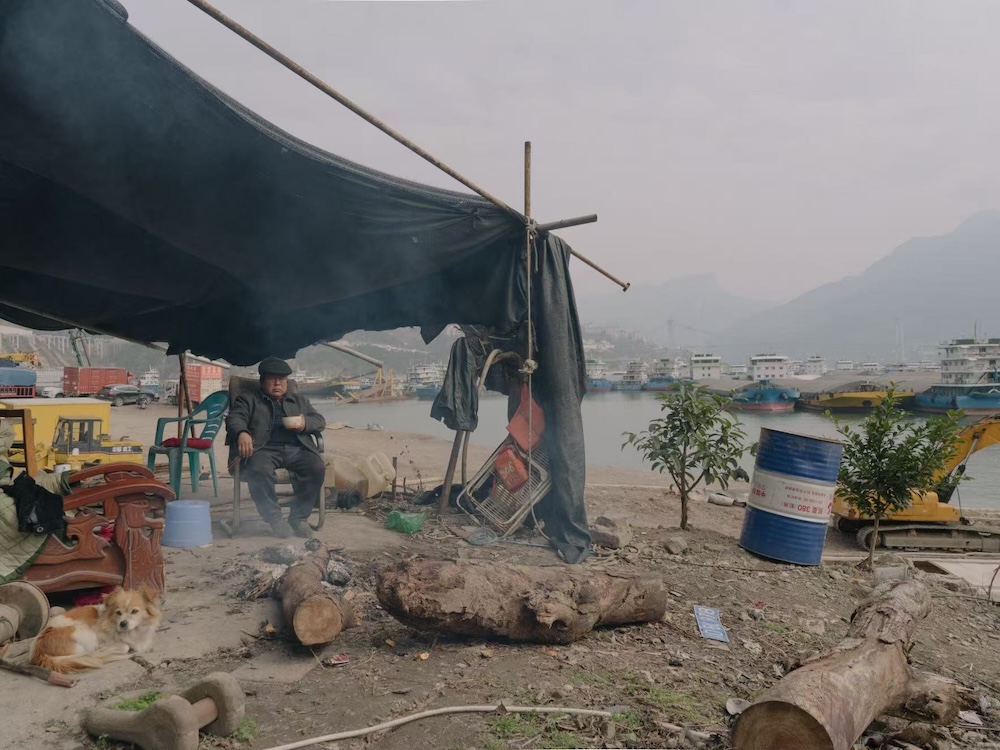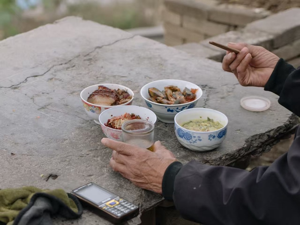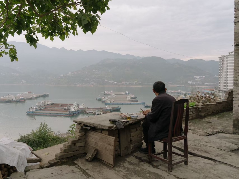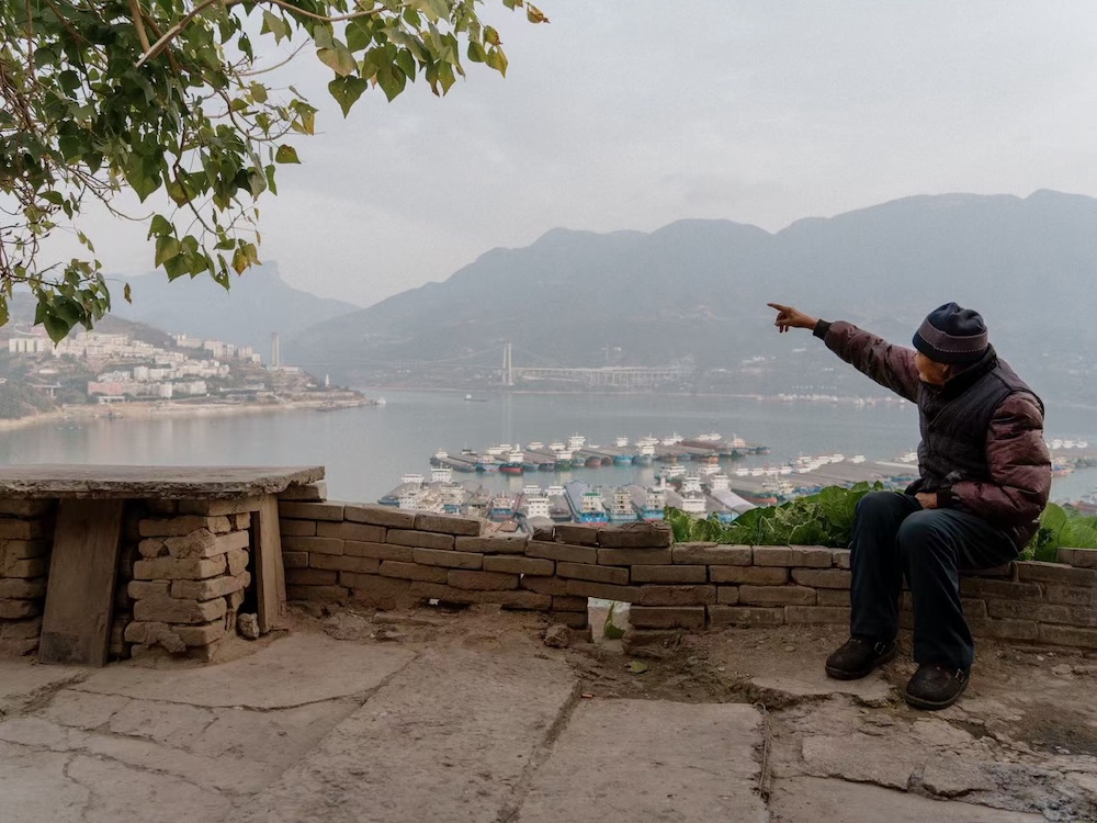 我常去一些地方感受变化,比如奉节,我去了三次。2024年春,我在那里遇见一位老人。我给他拍了照,他给我讲以前奉节老城的位置,以为我是坐飞机来的,便指着远处说那边有巫山机场,还邀请我留下来吃饭。今年年初再去奉节,我在那里看见一个人,应该是那位老人的儿子。当时他正坐在江边,面前摆着像贾樟柯电影《三峡好人》里那种很有年代感的饭菜——三个菜、一碗粥,豆腐乳、炒鸡蛋,还有一杯酒。饭菜摆在石头上,他面前就是三峡夔门和码头,一个人对着江喝酒。同一个位置,我没再遇见老人,不知他是否健在。他儿子,一杯酒,四个菜,一个人。他看着长江,我看着他。