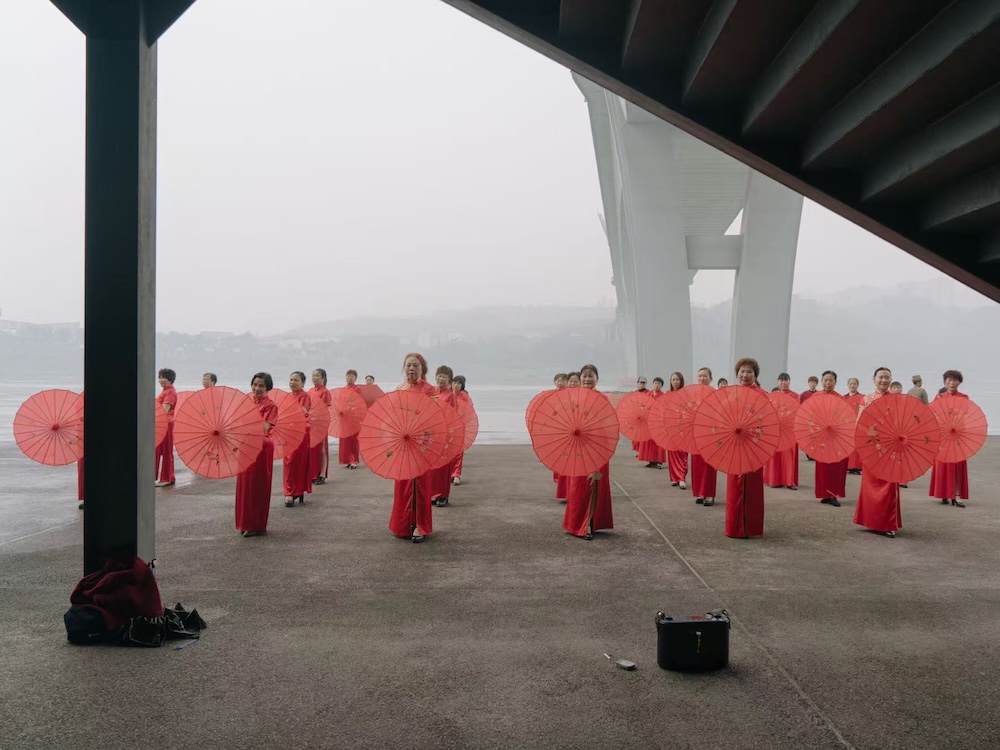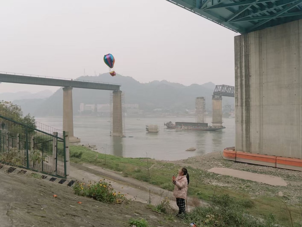 重庆有个叫珞璜的地方,我在珞璜遇到一处工地,工地旁有两座桥。一座是既能通高铁又能通动车的新桥,另一座是被淘汰、正在拆除的老桥。这座老桥是新中国成立后的第二座长江大桥,很有历史。工地旁是个小镇,我碰到了三个十来岁的小女孩。她们席地而坐,分享着小镇上的自有品牌,类似“享多味”那种炸鸡和汉堡,身边还摆着饮料、辣条和许多零食,三个人看起来就像来露营。开始我怕惊动她们,隔着围板观察。一般遇到这种场景,我会特别敏锐,总觉得接下来肯定有故事发生。果然,一个小女孩吃到一半,就跑到斜坡下玩气球。我果断拿起相机,拍下了这张女孩放气球的照片。这张照片给我留下了很深刻的印象,最后呈现出的效果也非常打动我——交错的新桥旧桥、小镇的女孩和放飞的气球。