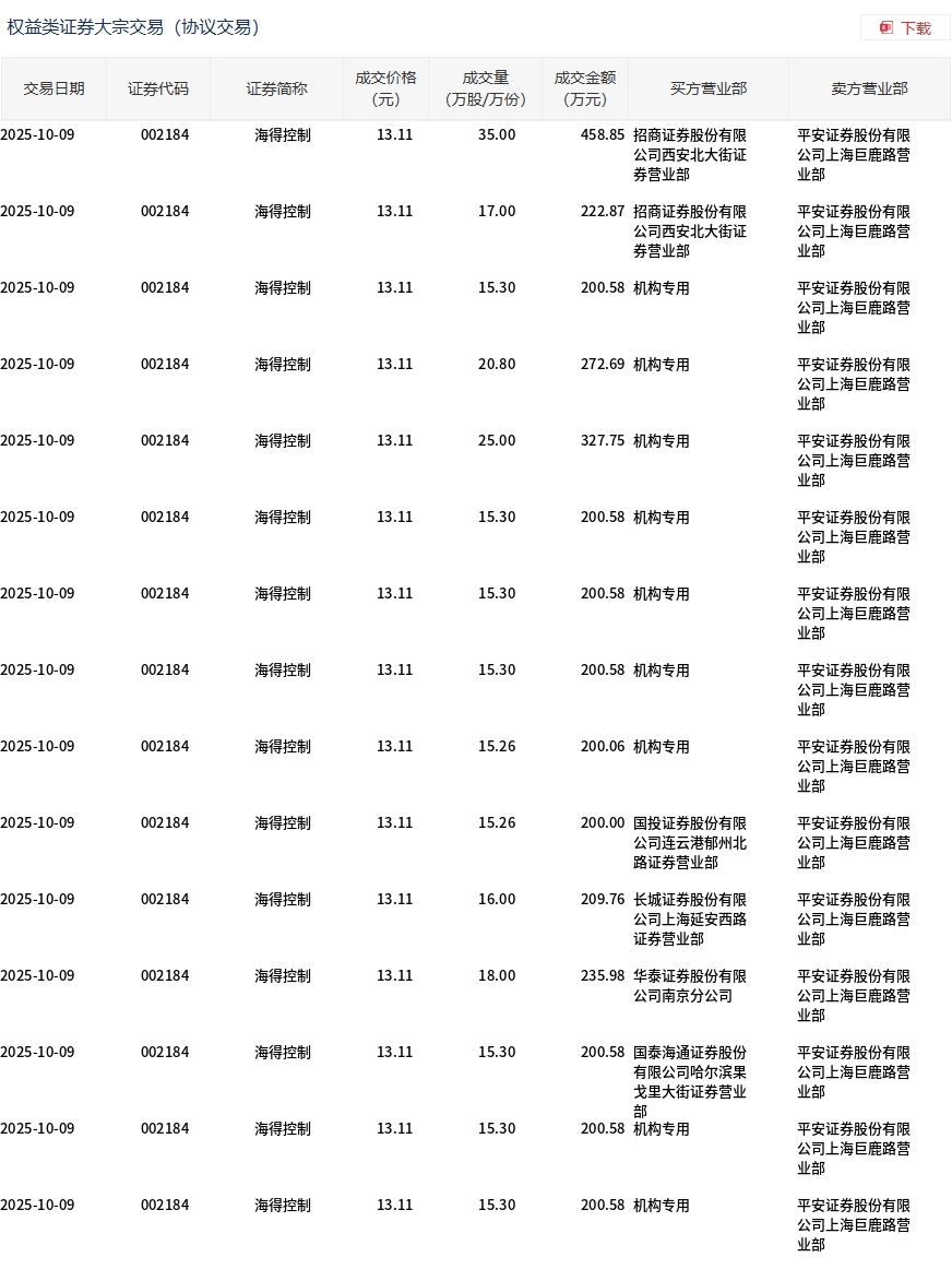 10月9日,海得控制大宗交易成交269.42万股,成交额3532.02万元,占当日总成交额的5.11%,成交价13.11元,较市场收盘价15.51元折价15.47%。