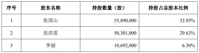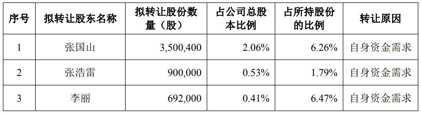 截至2025年9月30日,出让方所持首发前股份的数量、占公司总股本比例情况为:张国山持有公司股份5589.00万股,占公司总股本比例32.93%;张浩雷持有公司股份5030.10万股,占公司总股本比例29.63%;李丽持有公司股份1069.20万股,占公司总股本比例6.30%。