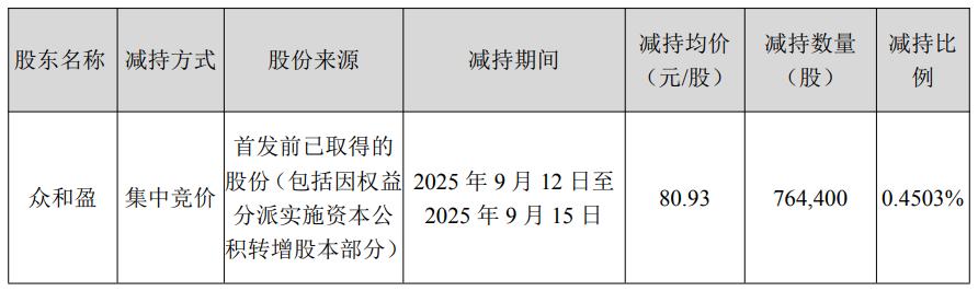 公告显示,因股权激励归属导致公司总股本增加及三河众和盈企业管理中心(有限合伙)(以下简称“众和盈”)主动减持的原因,控股股东、实际控制人张国山、张浩雷、李丽、王淑芬及一致行动人众和盈合计持股比例由75.0000%下降至73.9889%,权益变动触及1%的整数倍。众和盈通过集中竞价方式减持76.44万股,占公司总股本的0.4503%。