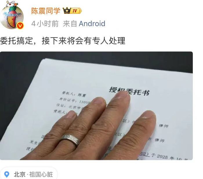 109日中午,针对3日发生的北京万寿路交通事故,知名车评人陈震发微博透露该事故的后续处理情况。他在微博中晒出了授权委托书,表示已经委托律师,委托搞定,接下来将会有专人处理。配发的图片显示为一份《授权委托书》,委托人为陈震。在评论区,陈震表示是为了配合对方律师
