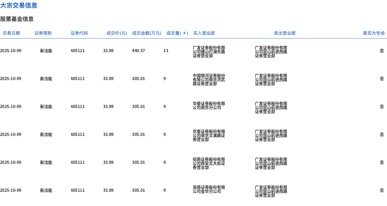 10月9日,新洁能大宗交易成交102万股,成交额3456.78万元,占当日总成交额的3.09%,成交价33.89元,较市场收盘价37.22元折价8.95%。