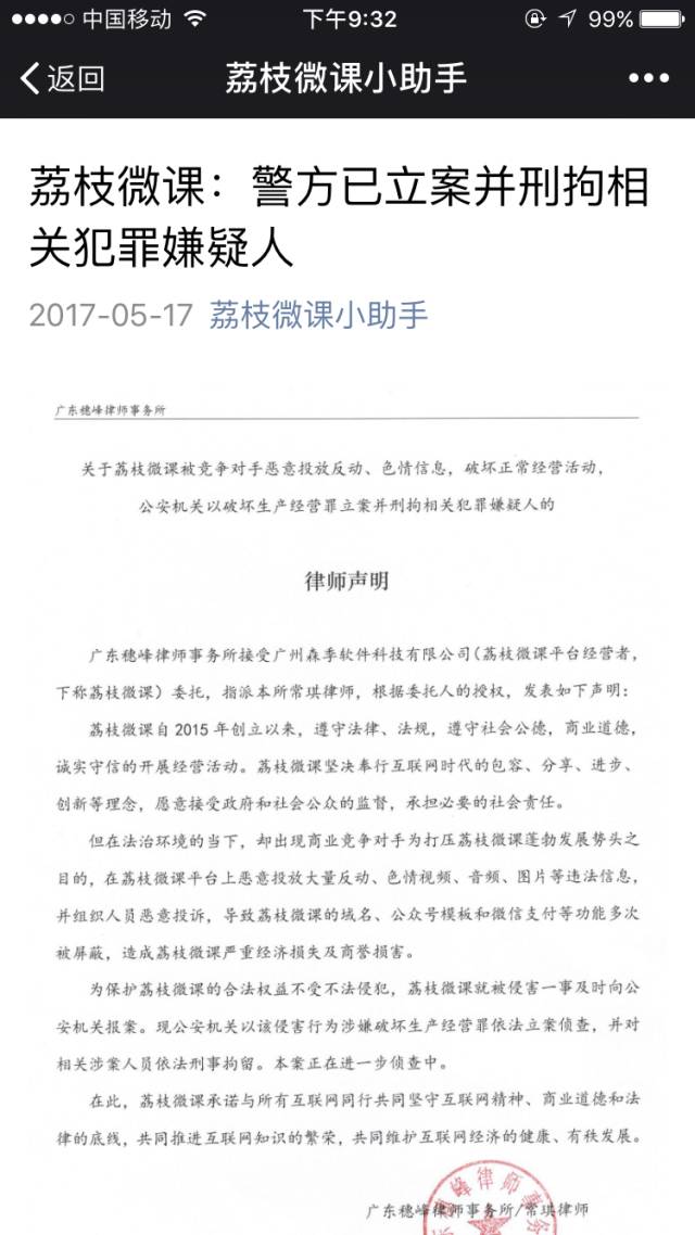 5月17日,知识付费平台荔枝微课发表声明称,自己平台被恶意投放大量反动、色情的视频音频和图片资料,导致了荔枝微课域名、公众号模板和微信支付等功能被多次屏蔽。