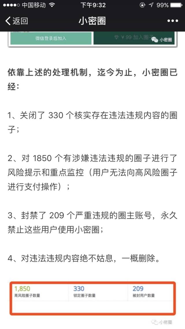 一篇名为《付费社交、付费内容,还是付费情色?》的文章在5月发布后,小密圈立即发表了声明回应称,小密圈已经关闭了330个核实违法圈子,封禁了209个违规圈主账号,以及对1850个有涉嫌违法违规的圈子进行风险提示和重点监控。