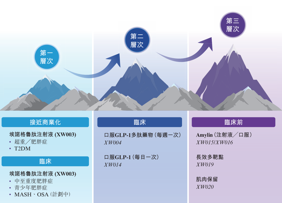 第一层次是即将实现商业化的埃诺格鲁肽注射液,作为当前核心推进产品;第二层次涵盖口服治疗创新药物XW004与XW014,聚焦剂型创新以拓宽应用场景;第三层次则包括Amylin多肽类似物XW015及XW016、长效多靶点产品XW019,以及具备减重与肌肉量保留双重效果的XW020。