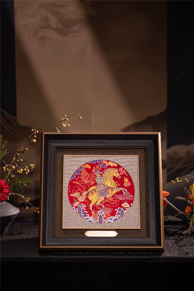 在东方文化里,龙与马向来是力量进取和吉祥的象征符号,而云锦为表现不同时代的美学内涵,草稿纹样都是由紫禁城里的宫廷画师先绘制成稿后,再送往南京进行云锦创作。南京云锦博物馆秉持“守正创新”的理念,从故宫清代宫廷画家郎世宁的《乾隆大阅图》中汲取灵感,在致敬名画与溯源云锦创作的同时,创作出新作《龙腾骏业》。画面中央,金色宝马昂首伫立,前蹄轻扬,生动诠释积极向上、奋勇开拓的精神。马身鞍鞯装饰精美,蓝、金等色彩交织辉映,背上宝瓶插戟,“瓶戟”谐音“平吉”,寄寓平安顺遂、官运亨通的美好愿景。龙,作为权威、尊贵与力量的化身,代表着突破一切的勇气与超凡智慧。龙与马相融并现,传递出刚健有为、自强不息的精神内涵,龙腾马跃间,以矫健身姿汇聚积极向上能量,祈愿事业如骏马奔腾、似蛟龙腾飞,骏业恒兴,福运绵长。
