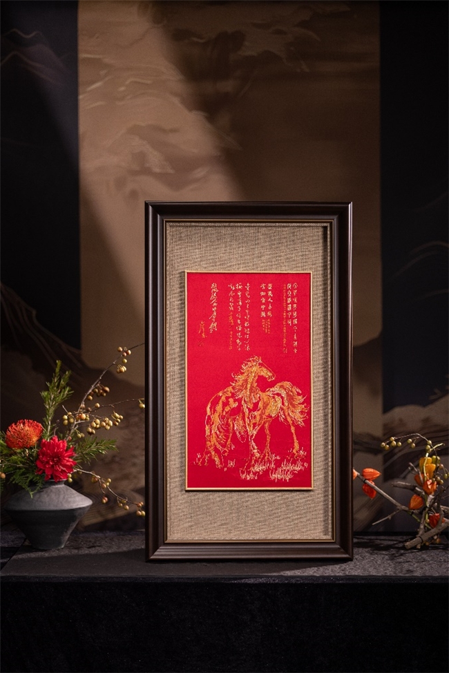 无独有偶,云锦博物馆与故宫博物院发展都在不断开放与创新,云锦的艺术表达也从现代作家的经典作品中汲取灵感。云锦作品《千秋骏业》灵感来源于徐悲鸿《双骏图》。徐悲鸿是中国现代美术史上的杰出画家,尤擅画马,其马作在拍卖市场极具价值,马的单价高达百万。在中国传统文化中,马被赋予了“马到成功”、“龙马精神”的吉祥寓意,象征着一往无前、开拓进取、奋发向上的拼搏精神。云锦博物馆在创作上以织金工艺巧妙表达姿态各异的两匹骏马,一匹马气定神闲吃草,代表着有禄可食,有业可守,一匹马驻足远望,代表着高瞻远瞩,两匹马代表着千秋万代,骏业永固,各尽其妙。
