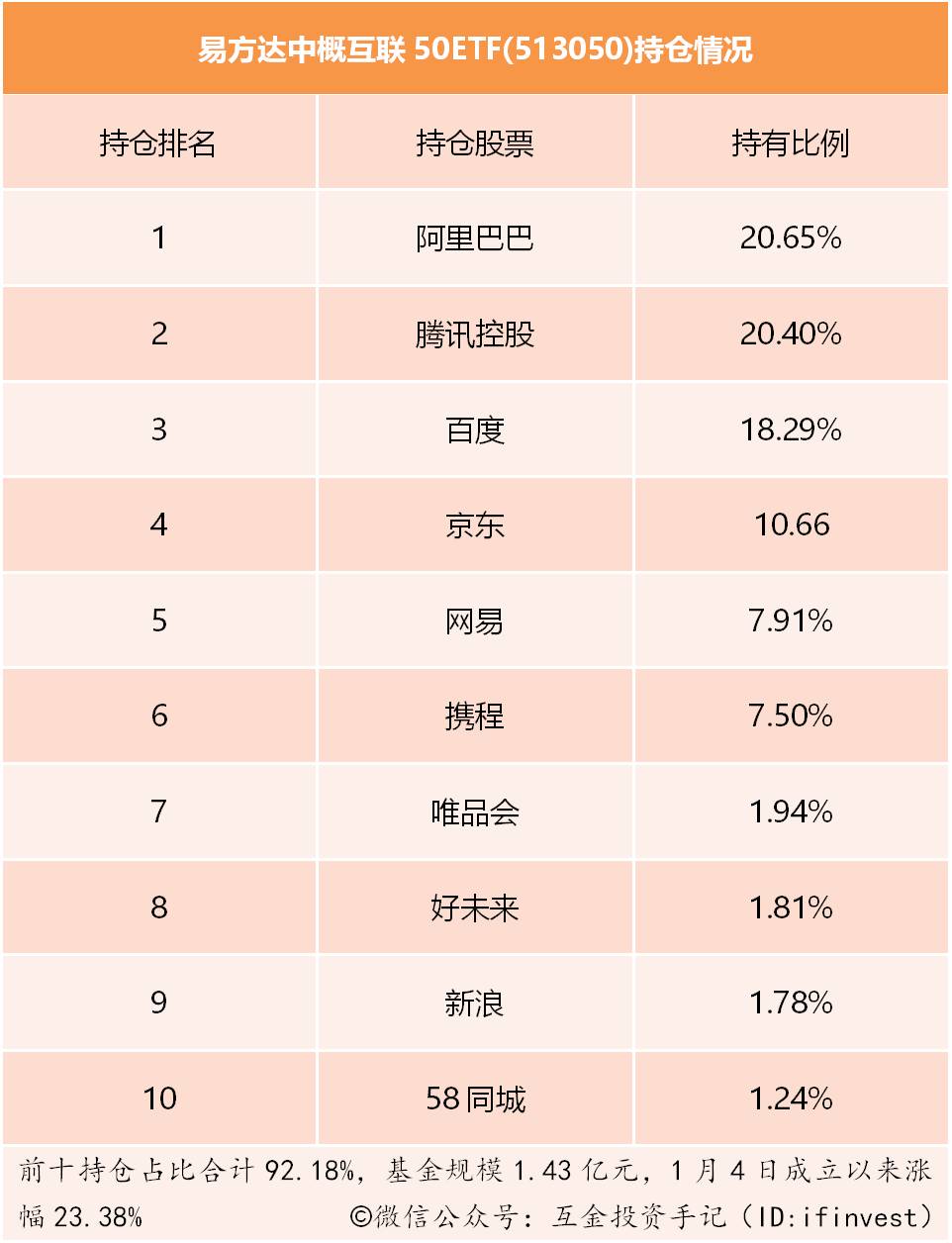 易方达中概互联ETF(513050)基金几乎完全是投资于中概股,前三大重仓股分别是阿里巴巴、腾讯控股和百度,累计占比为59.34%。