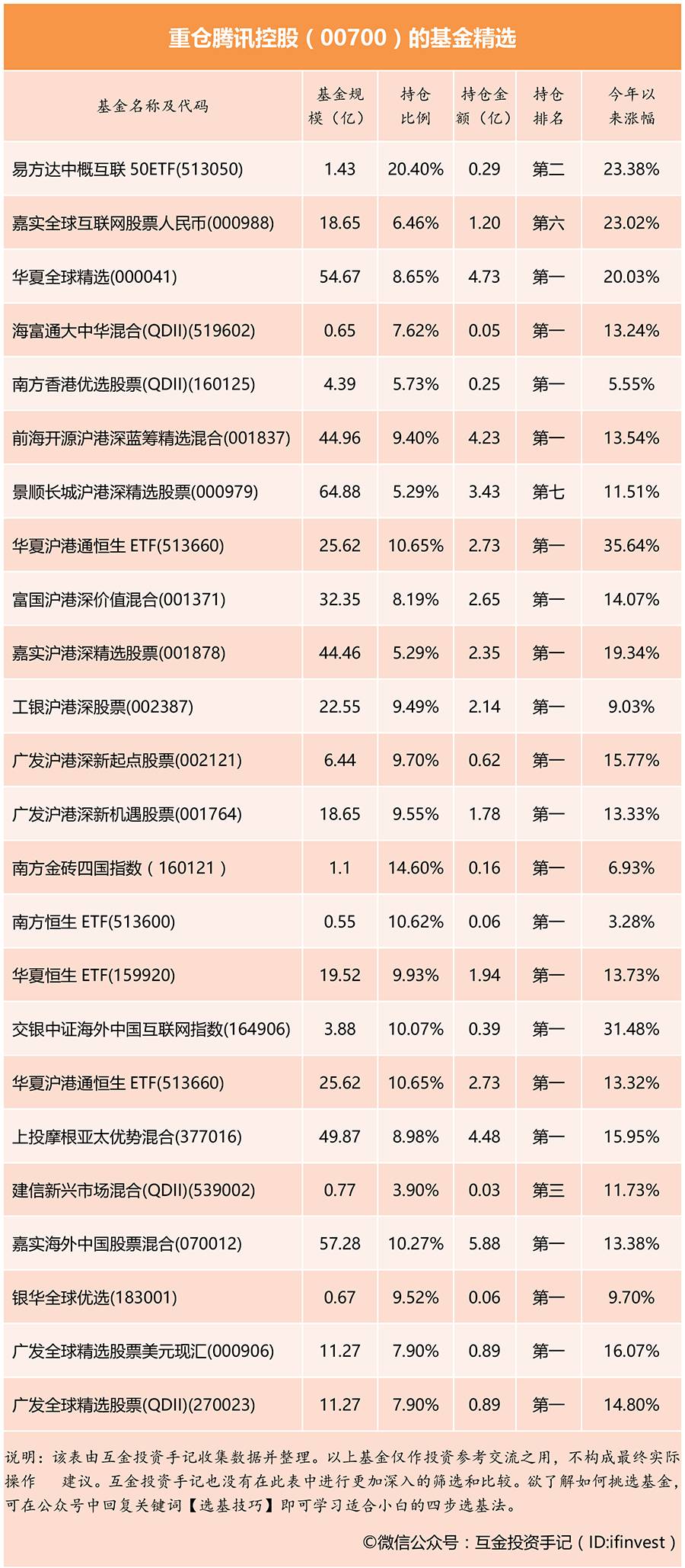 要结合基金规模、持仓比例以及前十持仓占比来看。就本次的主题腾讯控股而言,优先选择持有腾讯比例较大的基金,然后再结合基金规模和前十持仓占比来选择。