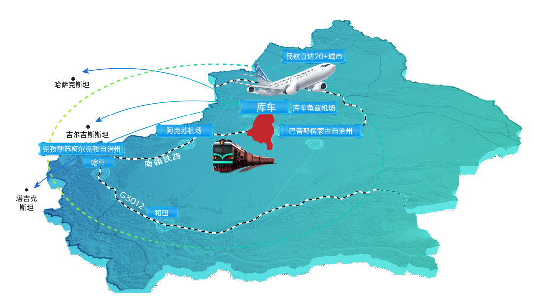 公路、铁路、航空四通八达,南疆铁路、3012国道横贯东西,G217国道(独库公路)贯通南北,伊阿铁路、独库高速全面开工,民航直达北上广西安等20多个主要城市,铁路接驳中欧班列,500公里内直通欧亚多个口岸。库车,正是新疆“东进西出、南联北拓”战略中不可或缺的一环。
