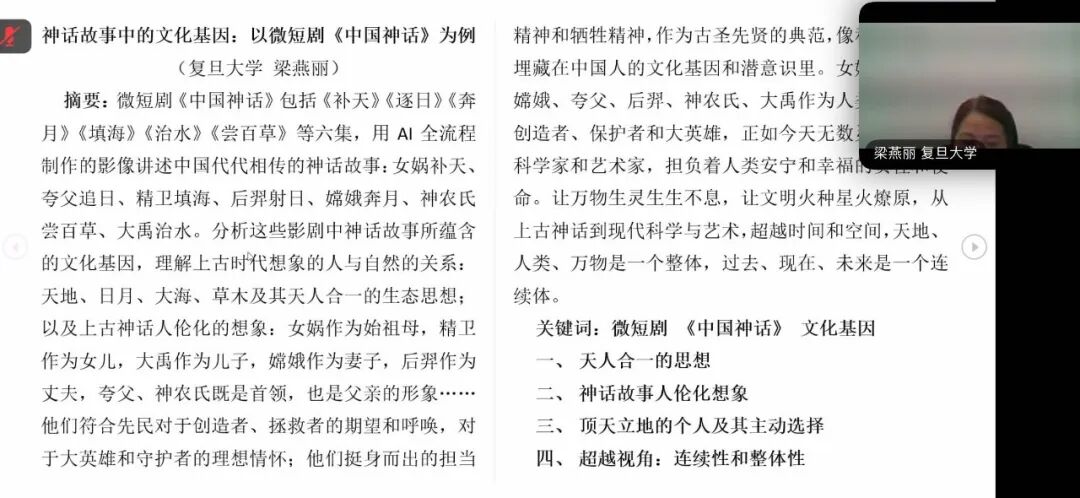 复旦大学中文系梁燕丽教授以《神话故事中的文化基因:以微短剧〈中国神话〉为例》为题,聚焦AI技术赋能下传统文化的影像转化路径。她提出核心观点:文化基因如同生物基因,兼具显性与隐性维度,且具备跨代传递与融合特征,而《补天》《逐日》等六集微短剧通过上古神话叙事,构建起独特又普适的中国文化基因图谱。