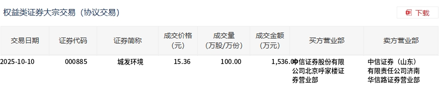 10月10日,城发环境大宗交易成交100万股,成交额1536万元,占当日总成交额的4.74%,成交价15.36元,较市场收盘价15.58元折价1.41%。