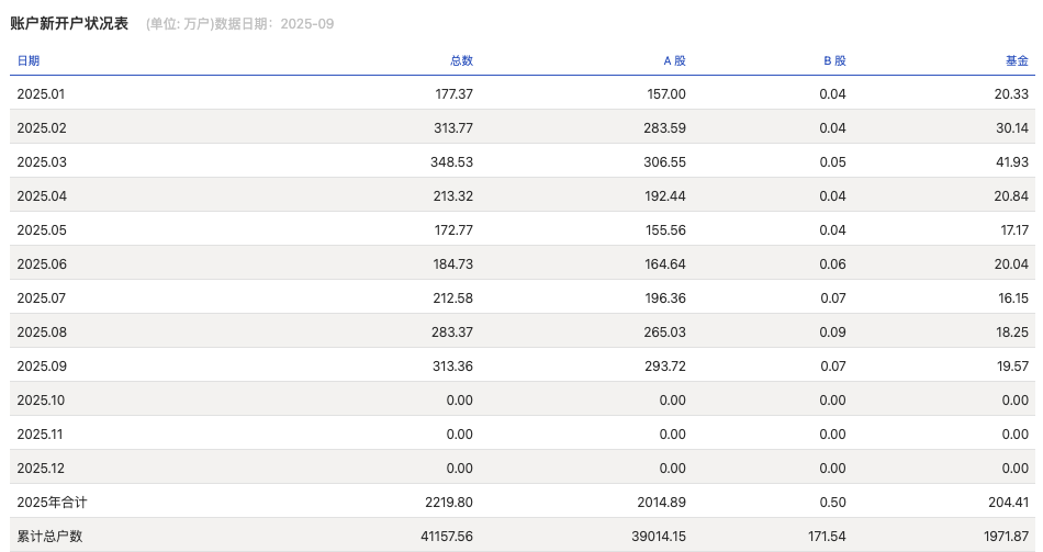 10月10日,上交所官网发布的新开户数据显示,今年9月上交所A股新开户数达到293.72万户,环比增长10.83%,同比增长60.73%。至此,今年前三季度A股新开户数合计已达2014.89万户,较2024年前三季度新开户数1346.46万户同比增长49.64%。