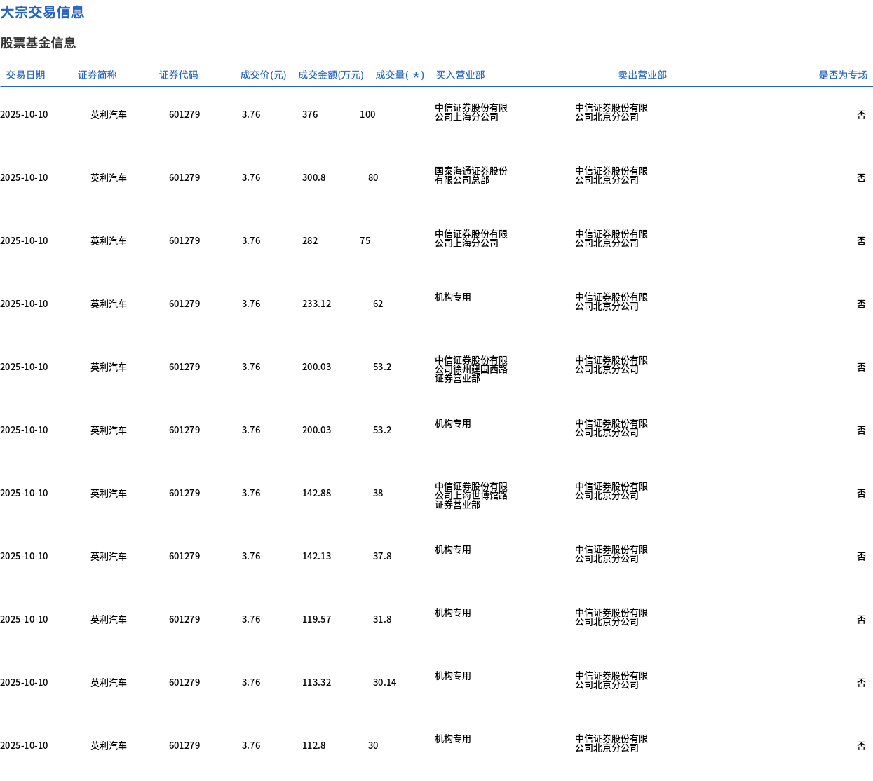 10月10日,英利汽车大宗交易成交591.14万股,成交额2222.68万元,占当日总成交额的11.2%,成交价3.76元,较市场收盘价4.6元折价18.26%。