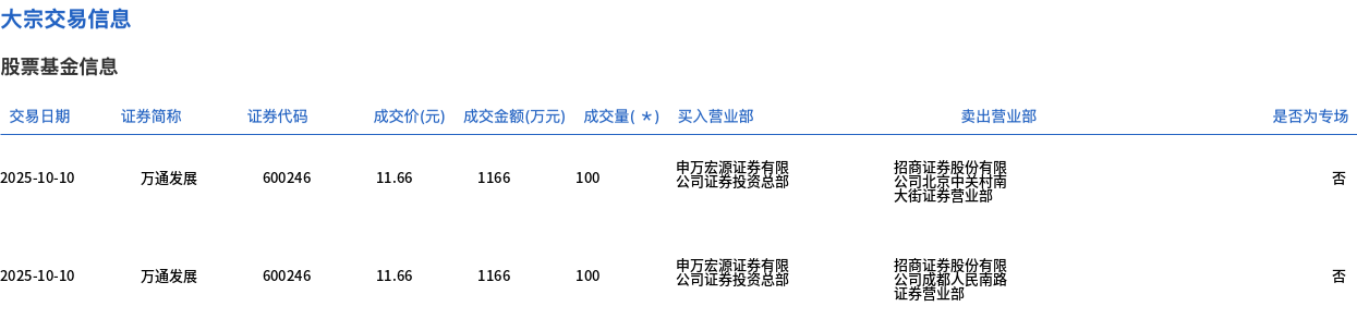 10月10日,万通发展大宗交易成交200万股,成交额2332万元,占当日总成交额的1.61%,成交价11.66元,较市场收盘价12.19元折价4.35%。