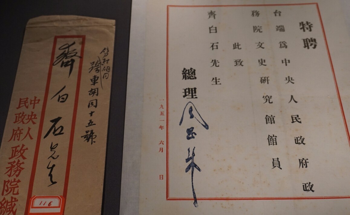 作为近现代中国书画大师,齐白石大师与北京画院的缘分源远流长。早在民国时,齐白石便名满天下,画院成立时,齐白石被聘为第1任名誉院长。本次展览展出了当初国务院寄给齐白石故居辟才胡同的聘书,以及齐白石与周恩来总理的亲密合影。