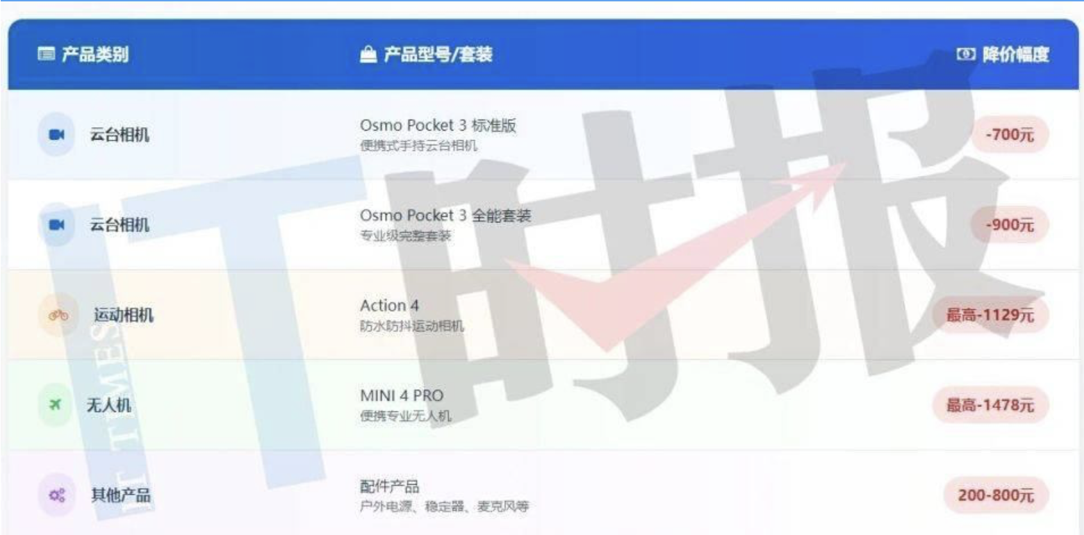 《IT时报》记者在电商平台观察发现,云台相机Osmo Pocket 3标准版降价700元,全能套装降价900元;运动相机Action 4最高降价1129元;MINI 4 PRO无人机最高降价1478元。户外电源、稳定器、无线麦克风、扫地机器人等产品也有200元~800元不等的降价。其中,Pocket 3等热门产品已显示缺货状态。