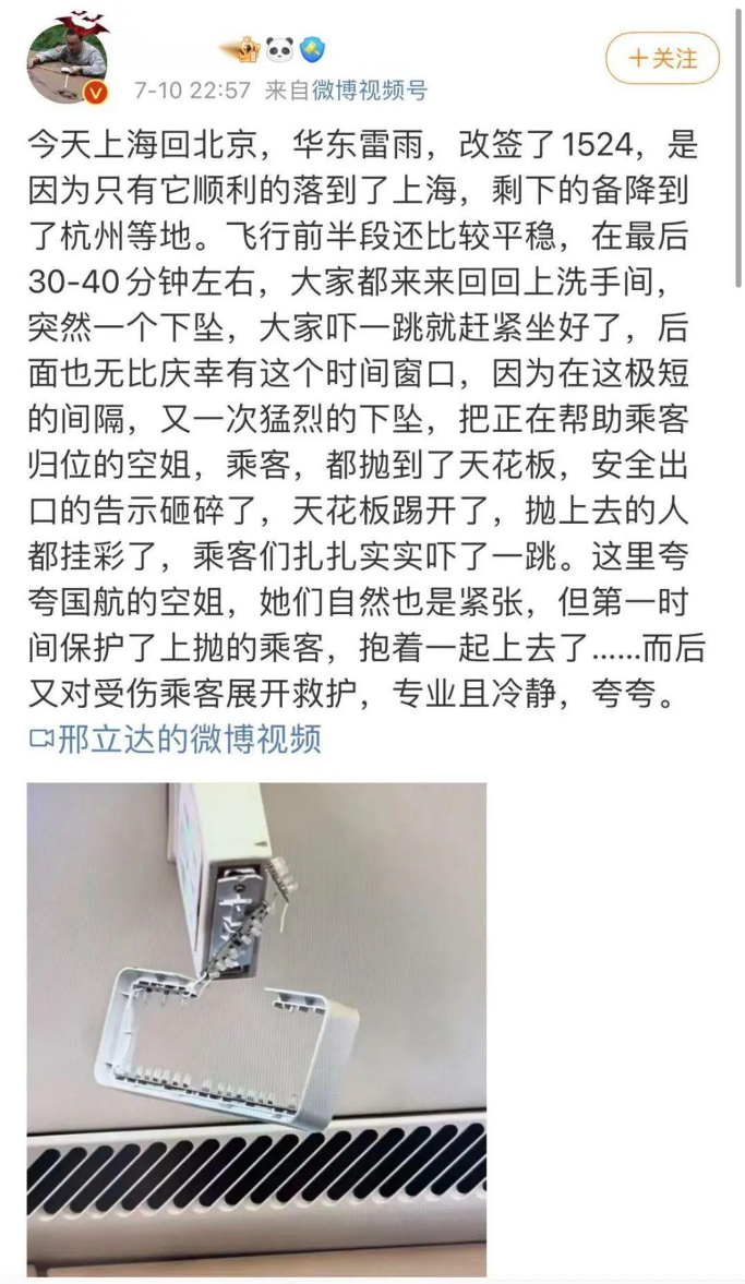 2023 年 7 月 10 日,中国国际航空 CA1524 航班(上海虹桥-北京首都)在飞行途中遭遇严重晴空颠簸,空姐毫不犹豫抱住女乘客,以自己的身体为肉盾保护对方,两人一起被抛向机舱天花板,安全出口的指示灯被撞坏。