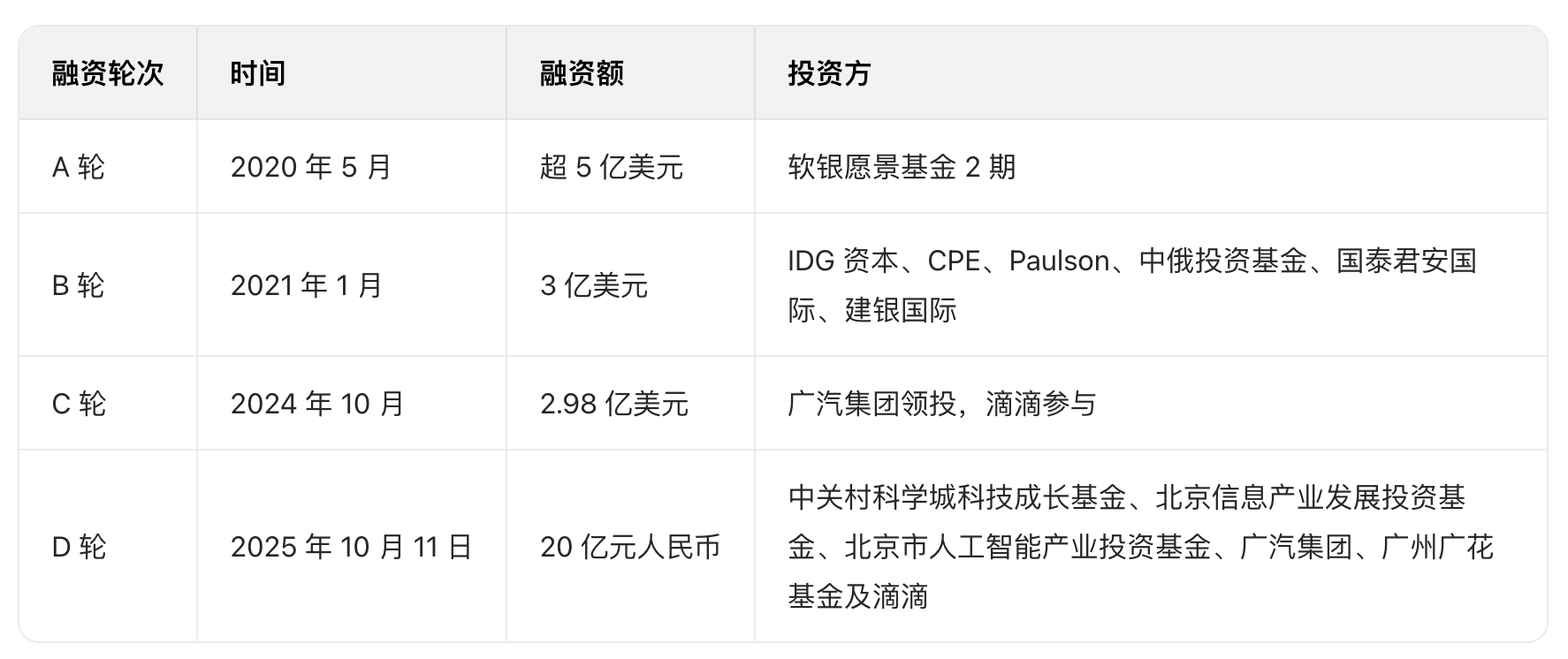 10月11日,滴滴自动驾驶宣布获得D轮融资,融资总额20亿元。投资方包括中关村科学城科技成长基金、北京信息产业发展投资基金、北京市人工智能产业投资基金、广汽集团、广州广花基金及滴滴。滴滴方面称,资金将用于加大AI研发投入、推动L4自动驾驶应用落地。