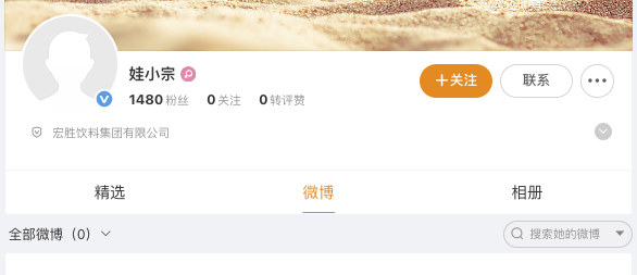 10月11日,一个名为“娃小宗”的微博账号已完成平台认证,其认证主体为宏胜饮料集团有限公司,审核通过时间为9月30日。截至发稿,该账号暂未发布任何内容,粉丝数为1480。