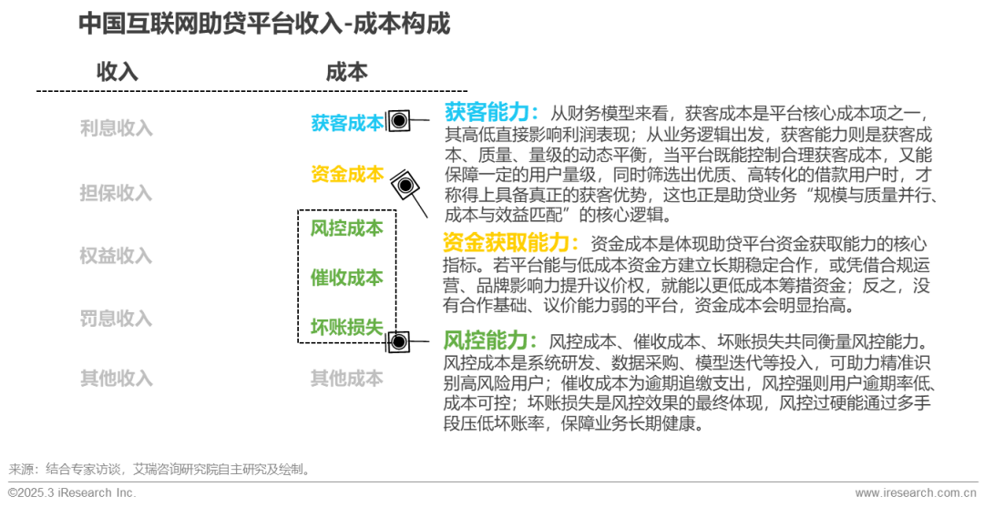 从助贷平台的收入-成本构成可以分析其核心竞争力。助贷平台的收入涵盖利息收入、担保收入、权益收入、罚息收入及其他收入。同一利率水平的不同平台收入差距相对较小,差异更多聚焦于成本侧。成本中的资金成本,体现平台从金融机构等渠道筹措资金的成本高低,是资金获取能力的直接反映;获客成本关乎平台触达目标用户的效率与成本控制,风控成本、催收成本、坏账损失则源于平台对风险的识别与管控水平,分别对应获客能力和风控能力。这些成本项的表现,实则是平台在资金整合、用户运营、风险管控等核心环节能力的外在体现,能力越强的平台,越能在成本端形成优势。