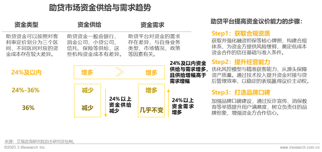 利率上限显性压缩后,银行、消金、信托等主流机构同步重新校准收益与风险阈值,收紧授信窗口,并对平台的资本实力、风险兜底能力及持续经营记录提出更高要求,进一步挤压缺乏牌照与增信工具的中小玩家。在此背景下,若平台仍想在 24%-36% 利率区间持续开展业务,就需要从合规资质获取、运营效率提升、市场信任构建这几个维度发力,凭借更扎实的风险管控能力、更优质的资产质量,以及更负责任的品牌形象,去争取与资金方议价时的主动权,进而在接下来的行业洗牌中抢占先机。