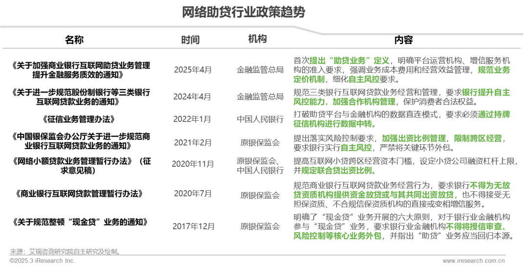 金融监管总局在2025年4月发布《关于加强商业银行互联网助贷业务管理提升金融服务质效的通知》(简称助贷新规),突出总行集中管理、白名单机制与综合成本披露等核心要求,不仅强化银行主体责任、遏制合作标准层层衰减,也明确限制平台收费结构与业务规模,推动行业从拼规模转向风控与服务质量的重视。对消费者而言,信息披露与行为规范得到进一步增强,有助于解决以往融资成本不透明、催收不规范等问题。整体上,新规意图在防范金融风险、保护消费者权益与促进良性创新之间寻求平衡,预计推动助贷行业进一步向合规化、透明化和集约化方向发展。