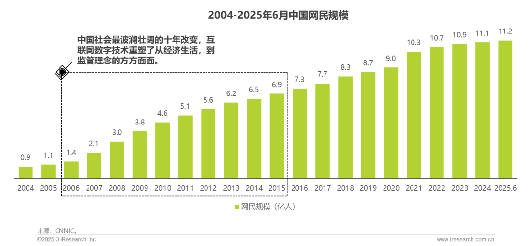 根据国家互联网中心的统计数据,2004年中国网民总数不足1亿,但是截至2025年这一数字已经上升到11.2亿。其中2006年到2015年这十年是网民增长速度最快的十年,也是数字经济在人们尚未有所反应时,迅速重塑中国社会的十年。改变起始于用户获知信息的方式,深化于社会经济生活的模式。