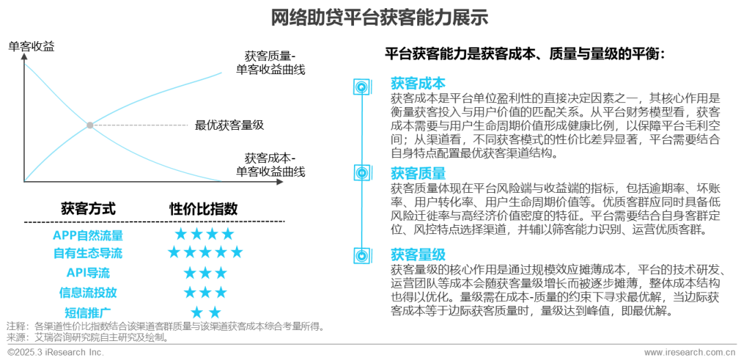 助贷平台获客能力的本质是获客成本、获客质量与获客量级之间的平衡。单客成本低,有可能带来高风险、低黏性的次客群;过度追求质量,又可能因单客成本过高而使财务模型利润过薄;而盲目冲量,则可能在边际收益递减的拐点后把利润吞噬殆尽。因此,平台必须先把客群画像、风控能力与资金价格算清,再选择适合自身平台的获客渠道,并配置渠道结构。目前市场上主流的获客方式有五种,综合各渠道成本与客群质量,其性价比由高到低为:自有生态导流>APP自然流量>API导流>信息流>短信,形成“得流量者得天下”获客市场,提示中小平台在缺乏自有场景与品牌积淀的背景下,只能以更高价格竞购次级流量,并通过差异化风控在高利率区间覆盖高风险,方能维持放贷规模与利差。