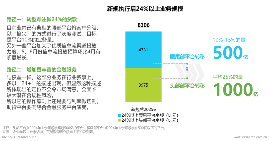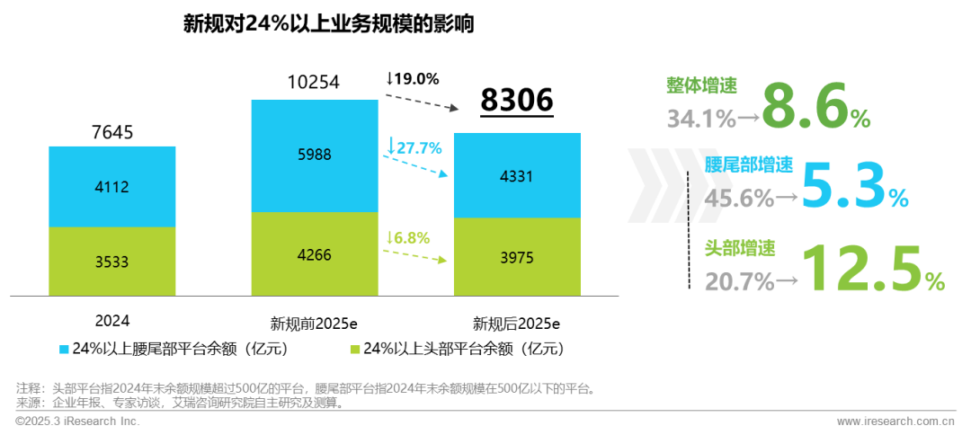 2024年24%以上业务规模为7645亿,其中头部平台余额为3533亿,腰尾部平台余额为4112亿。新规出台之前我们结合市场趋势、各家放款情况与业务目标,预计2025年底24%以上业务余额规模达到10254亿,其中头部平台余额为4266亿,腰尾部平台余额为5988亿。新规出台之后,综合分析行业动态与新规对行业的影响,我们预计2025年底24%以上业务规模将在8306亿左右,相较新规之前降低19%;其中头部平台余额为3975亿,相较新规之前降低6.8%;腰尾部平台余额为4331亿,相较新规之前降低27.7%。从24%以上业务同比增速层面,新规导致整体业务增速从34.1%将至8.6%,头部平台增速从20.7%将至12.5%,腰尾部平台增速从45.6%将至5.3%。头部平台余额缺口主因为监管不确定性与贷后处置成本抬升,资金端虽充裕却主动压缩高风险敞口;腰尾部平台核心瓶颈是资金渠道收窄、流动性缓冲不足,次要压力来自政策不确定性与催收合规成本上行。