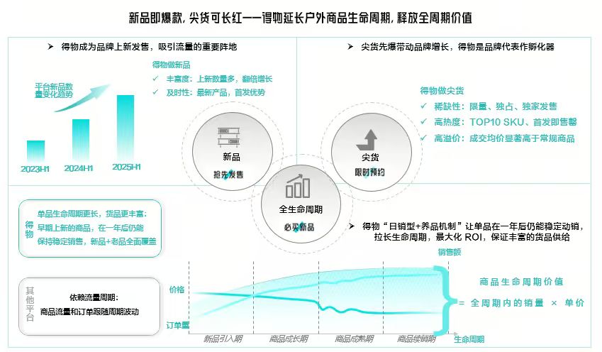在巨大的市场潜力下,Z世代为户外品牌提供强劲的新增长动力。截至目前,1300多个户外品牌在得物App通过首发新品、尖货限时预约、日销和长期养品机制,推动高热度向长期高销量转化,完成从爆款到经典代表作的沉淀。