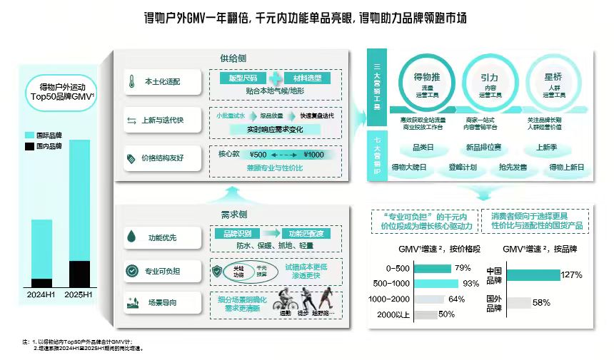 基于得物App优质的年轻用户群和独特业务模式,众多户外运动品牌实现从新品到爆品,从单一品类爆发到多品类的突破。2025年春节,迪桑特“CREAS夹克”在得物App官方限定首发,1分钟即售罄,圈粉了10万新客户,并带动品牌销量同步上涨215%;骆驼品牌入驻得物App 3年,实现了从冲锋衣的单一爆品到羽绒服、POLO衫、冲锋衣等多品类领先的进阶,实现了GMV从0到9亿的突破。2025年至今,迪桑特品牌上半年已达成24年全年的亿级销量,凯乐石品牌同比三位数增长,可隆品牌连续3年保持双位数增长。