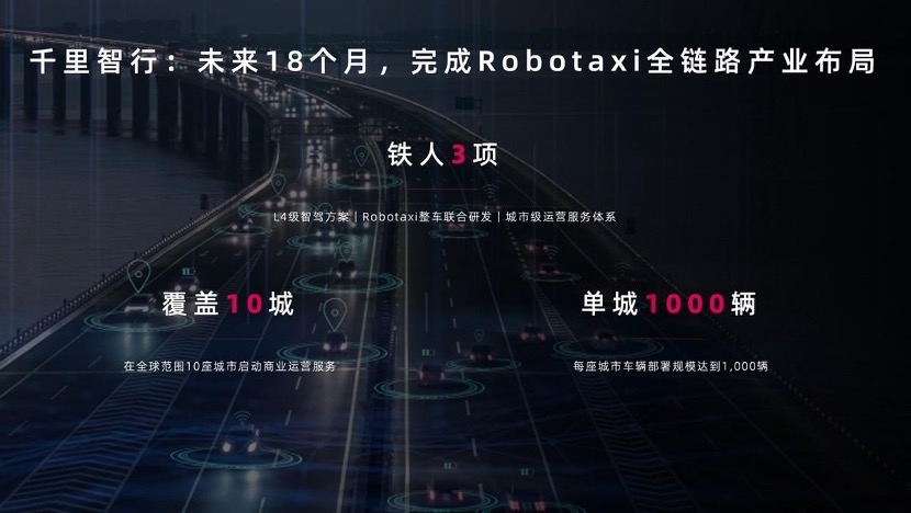 为了实现这一点,千里科技目前正在与吉利合作研发Robotaxi车型,计划未来18个月内在全球10座城市规模化提供Robotaxi运营服务,单一城市部署超千辆Robotaxi。