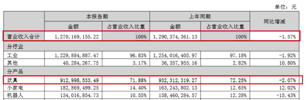 数据显示,今年上半年,爱仕达的炊具实现营收9.13亿元,同比下滑2.07%,这带动总营收同比下滑1.57%至12.7亿元。