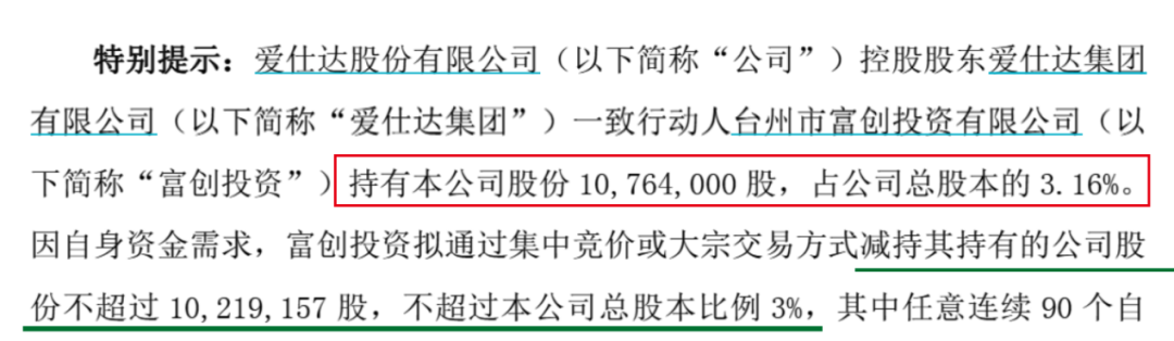 近日,爱仕达发布公告称,控股股东爱仕达集团一致行动人富创投资拟减持不超过1021.92万股,不超过公司总股本的3%。