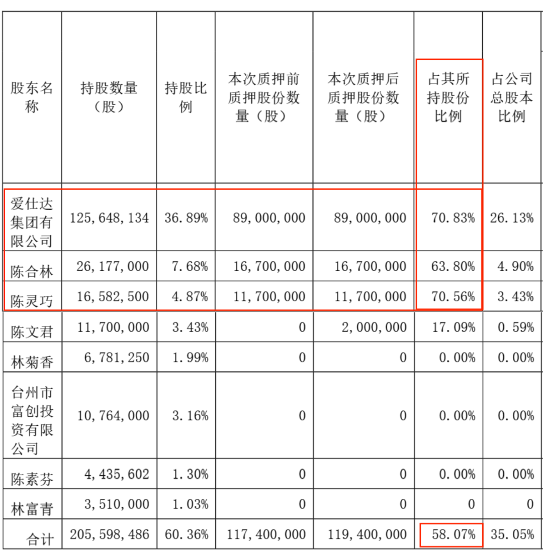 在此之前,爱仕达集团(陈合林家族100%持股)、陈合林、陈合林之女陈灵巧已经累计质押了1.17亿股公司股票,各自质押的股份占所持股份的60%以上。