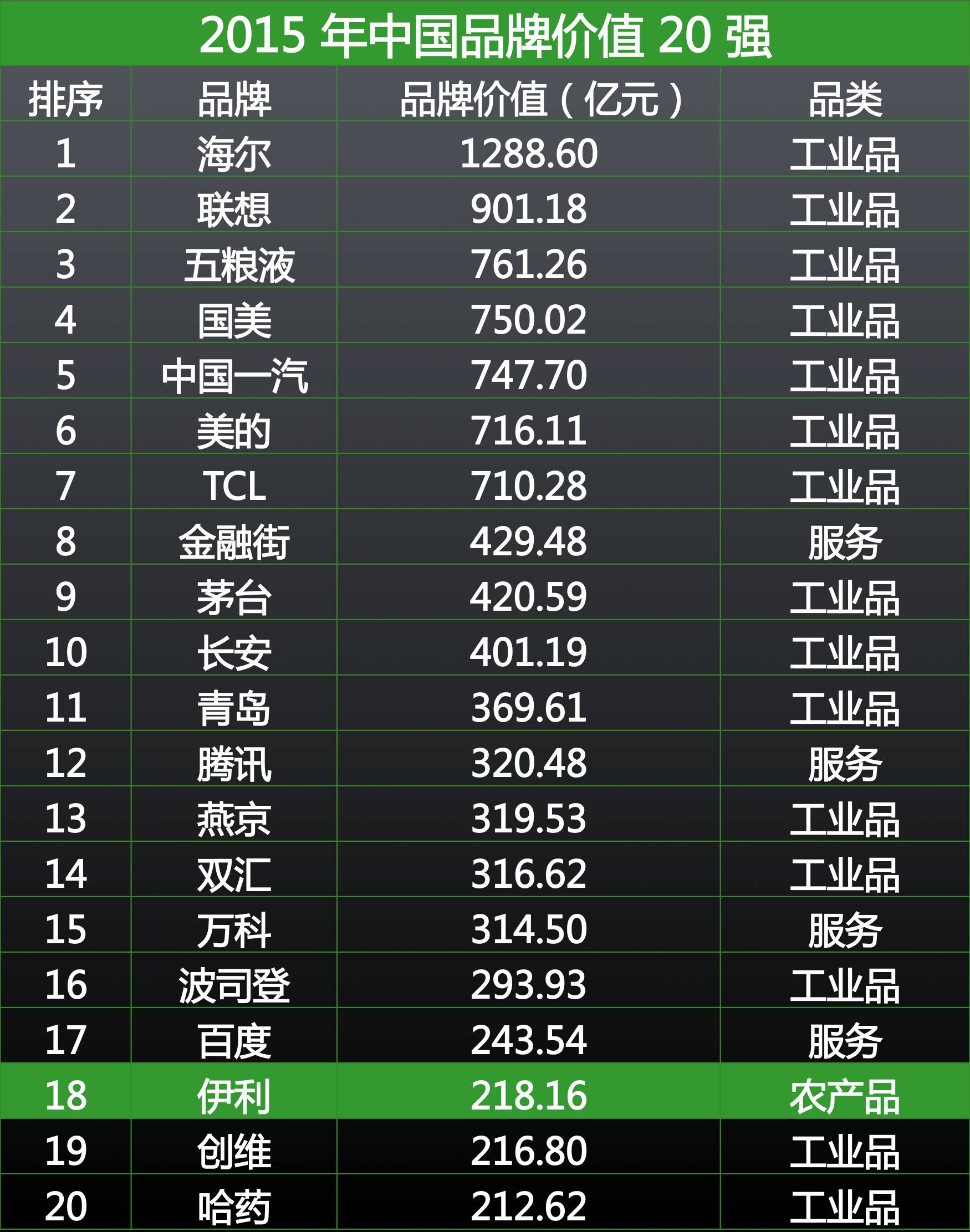 ▲ 在 2015 中国品牌价值 20 强中,伊利是唯一的农产品品牌。来源:中商情报网